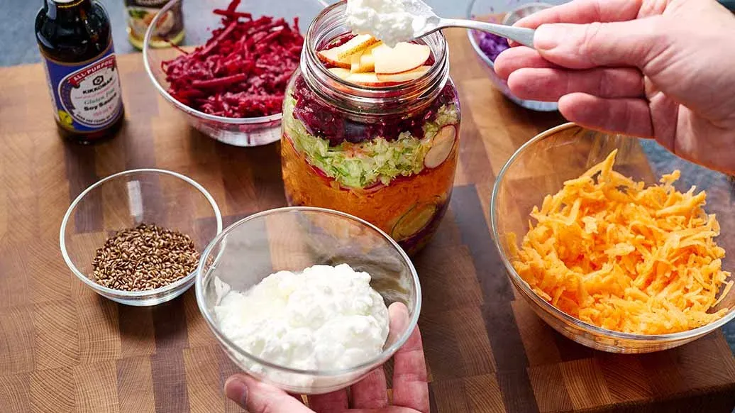 Layer the salad in a tall salad glass as follows: dressing, red cabbage, apple, carrot, radish, pointed cabbage, beetroot, pear, cream cheese and linseed. Close the jar and shake briefly before serving to distribute the dressing. Alternatively, serve the salad in bowls.