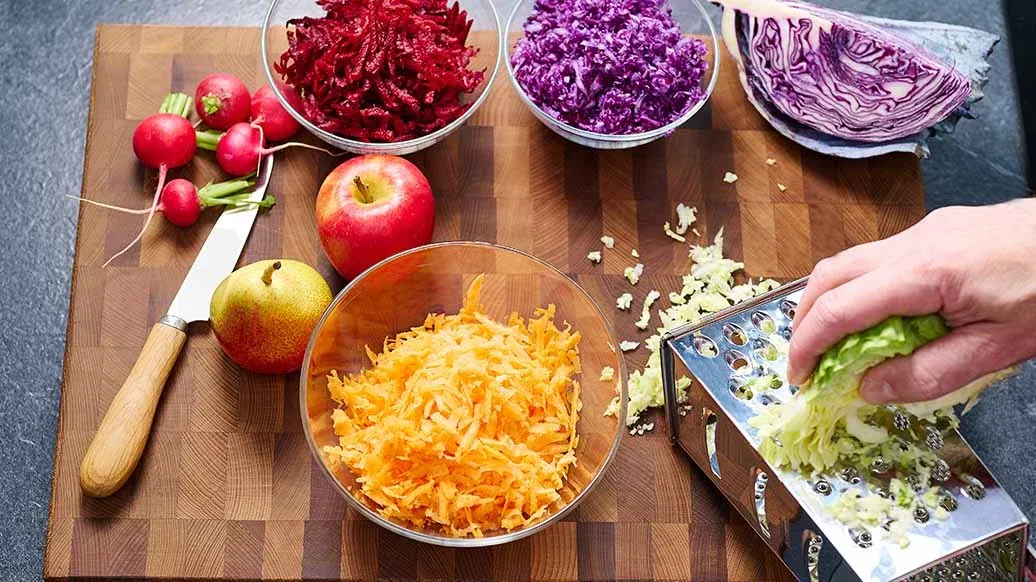 Roughly grate the pointed cabbage, red cabbage, beetroot and carrots separately. Slice the radishes, and cut the apple and pear first into wedges and then into slices.