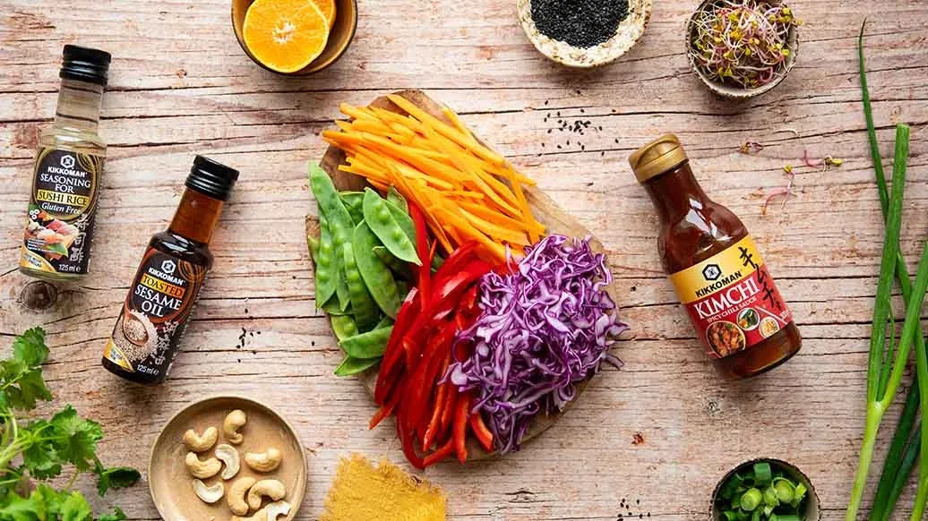 Bold in flavour and full of colour, this red cabbage salad with vegetables is topped with cashews, black sesame seeds and fresh coriander, all in a creamy dressing with Kikkoman Kimchi Chili Sauce and sesame oil.