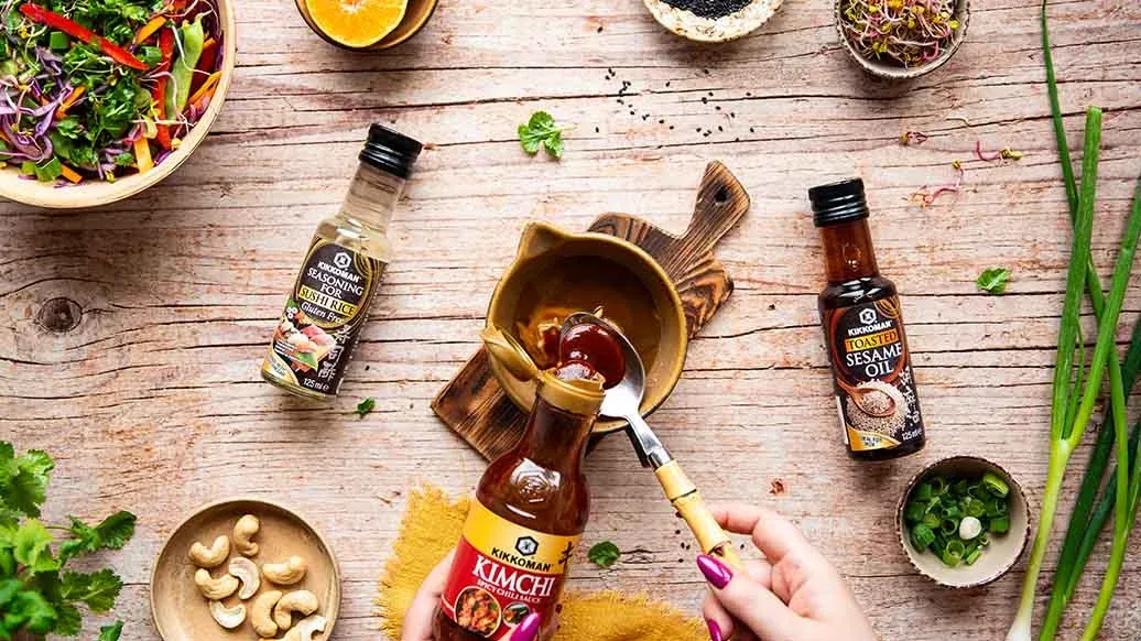 1 tbsp Kikkoman Spicy Chili Sauce for Kimchi – 1 tbsp freshly squeezed mandarin juice – 1 tbsp peanut butter – 1 tbsp Kikkoman Toasted Sesame Oil – 1 tsp maple syrup – 1 tsp Kikkoman Seasoning for Sushi Rice (125ml) – ½ tbsp water – 20 g cashew nuts – 2 tsp black sesame seeds