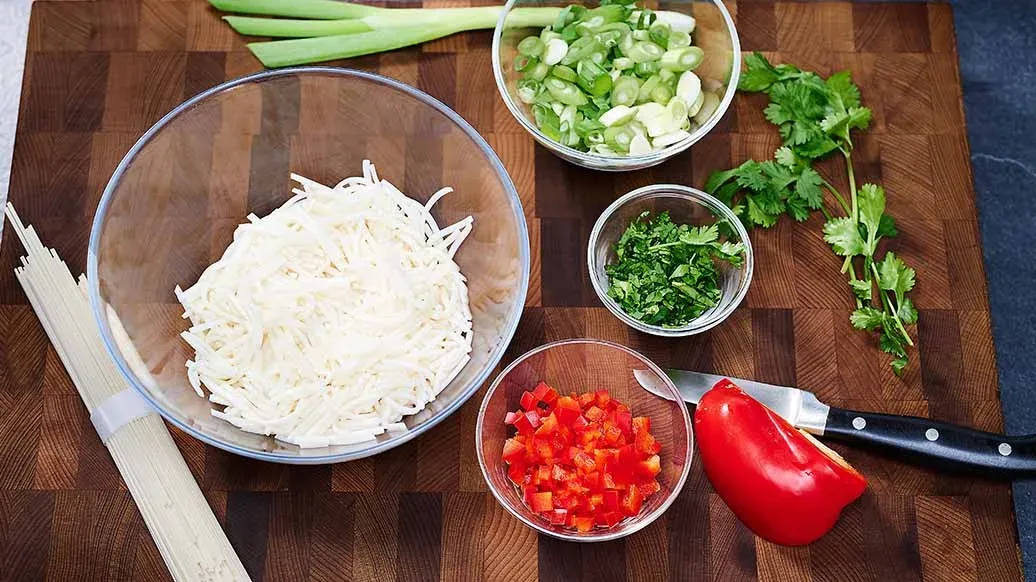 Cook the noodles according to the packet instructions and cut them into small pieces. Slice the spring onions. Finely chop the coriander. Dice the red pepper.