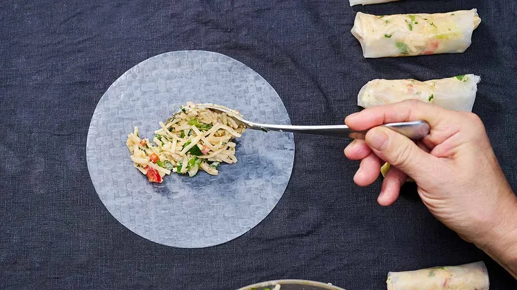 Dip each sheet of rice paper briefly in cold water and place it on a damp tea towel. Put about 1 tbsp of filling on each sheet, fold in the sides and roll up.