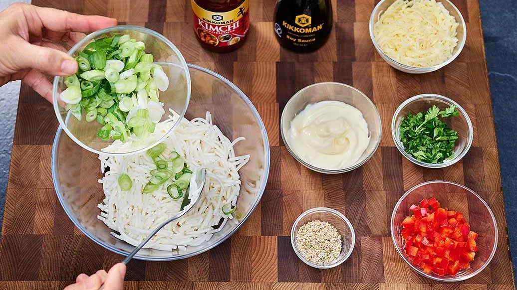 Mix the noodles with two-thirds of the spring onions, the coriander, red pepper, sesame seeds, the Kikkoman Kimchi Chili Sauce, the mayonnaise, cheese and Kikkoman Soy Sauce.