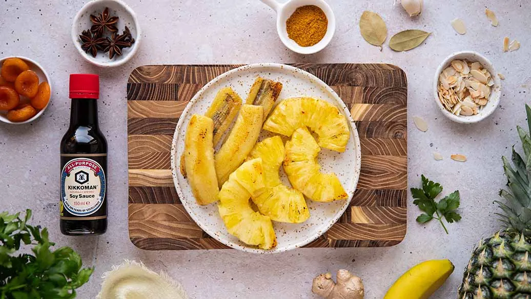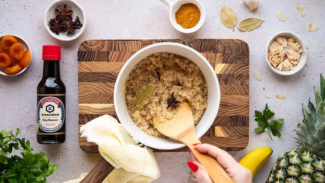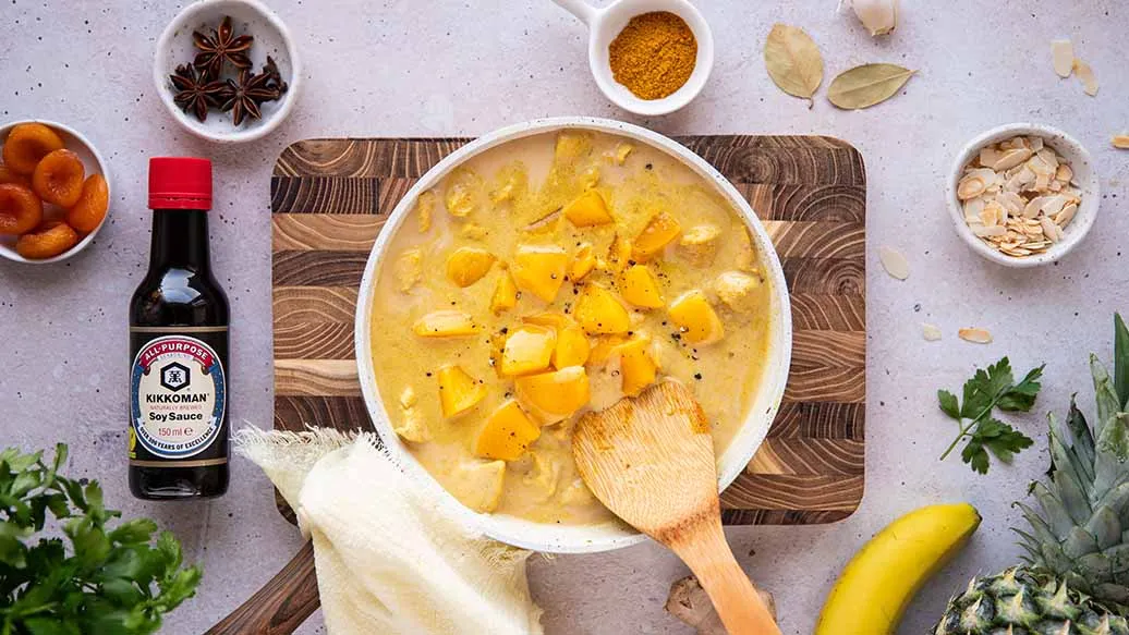 Riz Casimir combines tender chicken, gentle curry spices and sweet fruit. A splash of Kikkoman Soy Sauce adds depth and savoury flavour. Served warm, it’s a comforting, well-rounded dish.