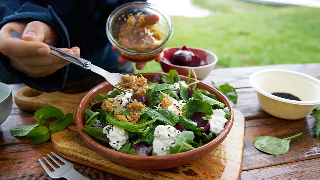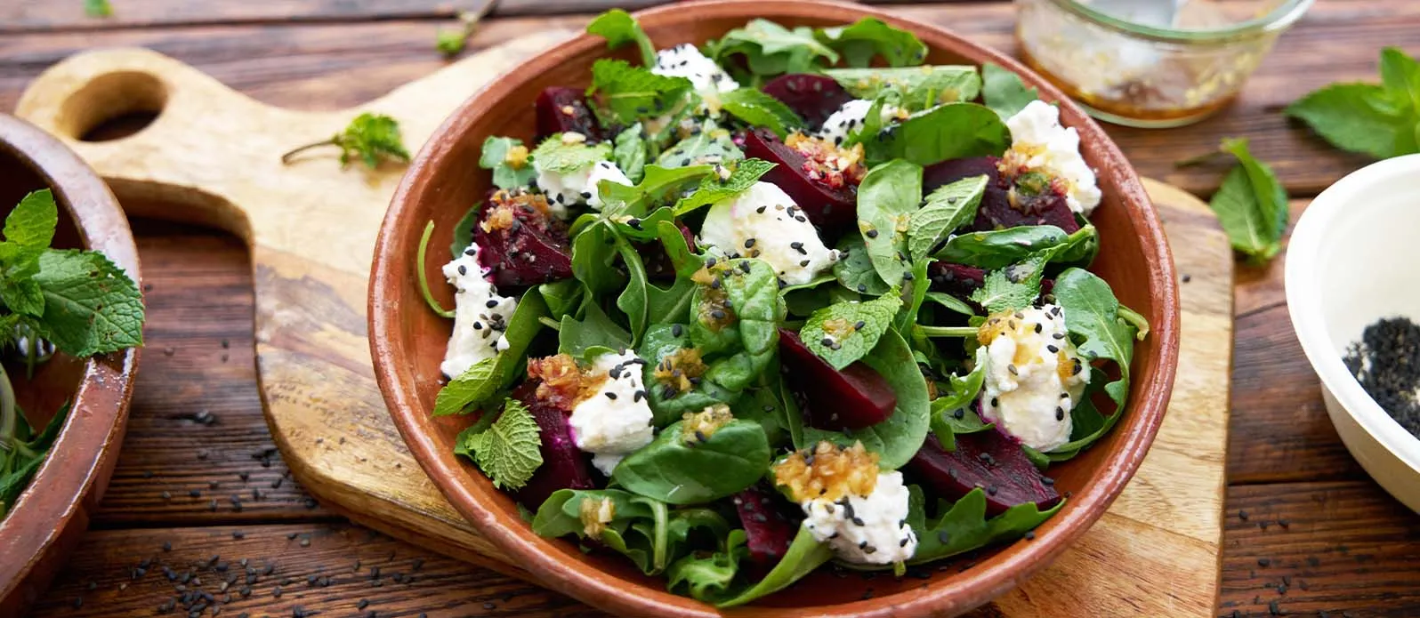 Cut the roasted beetroot into wedges and arrange on a plate. Break the ricotta into small pieces and add on top, then scatter over the rocket and spinach. Drizzle with the dressing, garnish with the mint leaves and sprinkle with the sesame seeds.