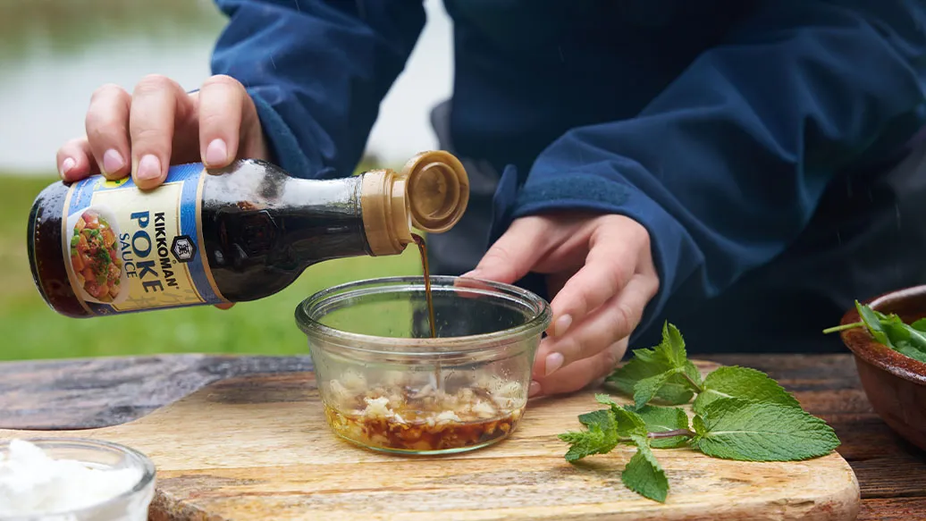 Finely chop the ginger and garlic, then combine with the Kikkoman Poke Sauce and honey to make a dressing.