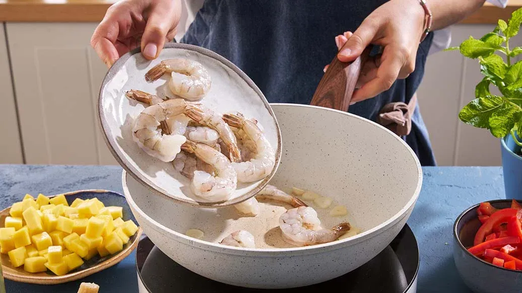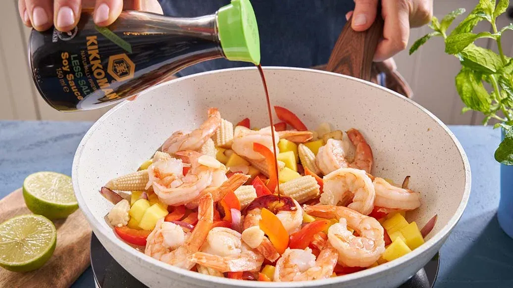 A vibrant stir-fry with shrimp, mango and lime, enhanced by the deep umami of Kikkoman Less Salt Soy Sauce—a perfect balance of freshness and richness in every bite.
