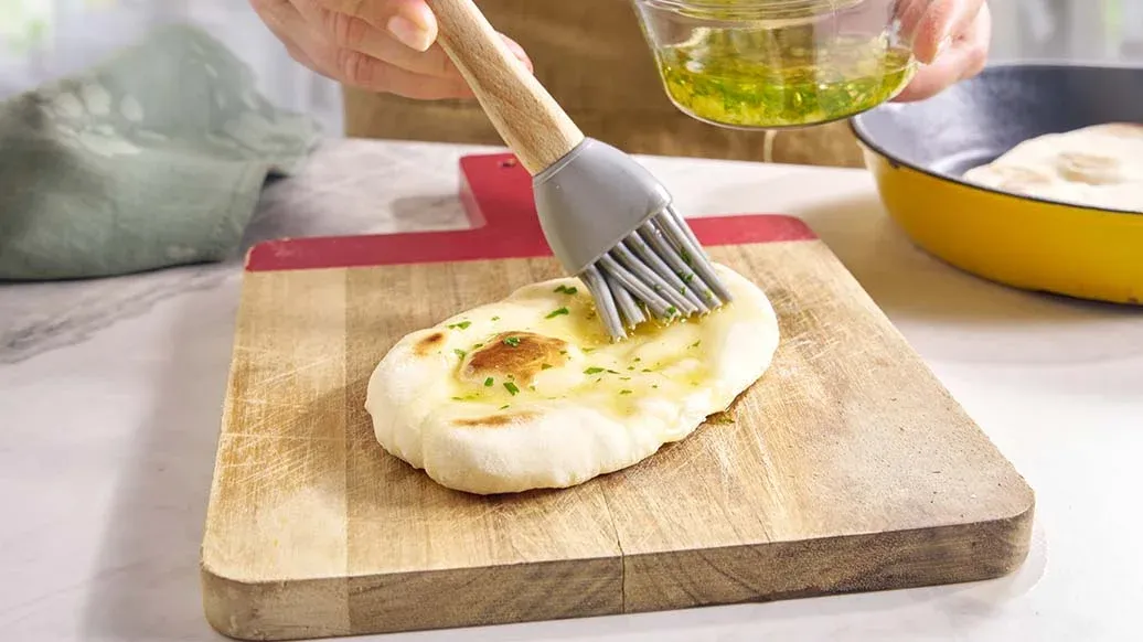 Heat a dry pan over medium-high heat and cook each flatbread for 2 minutes on each side until golden bubbles and char marks appear. In a small saucepan, melt the ghee, then add the chopped garlic and coriander. Slice the onion into rings. Brush the naan with the garlic butter and serve with the dal and onion. Garnish with the fresh coriander leaves.