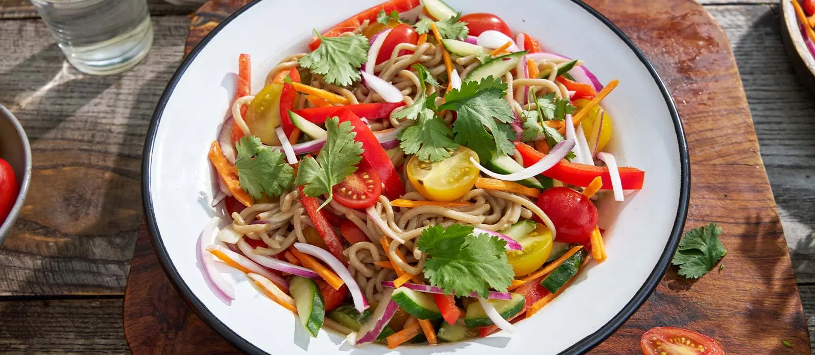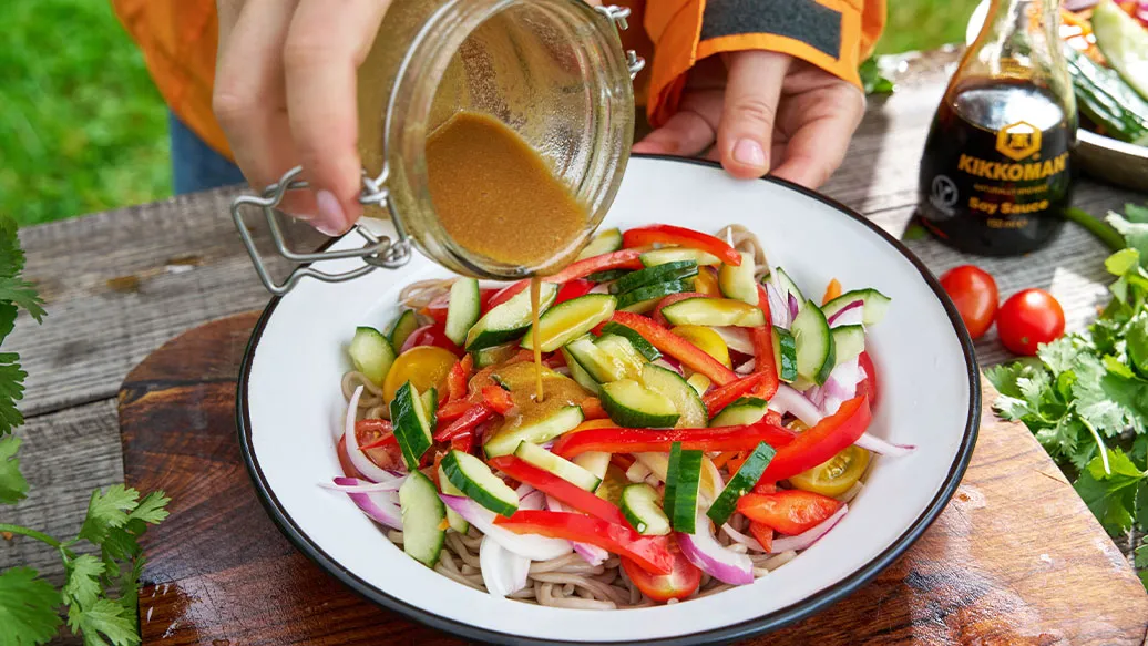 Soba noodles with crunchy vegetables and an aromatic dressing of Kikkoman Soy Sauce and tahini—a light and refreshing salad, ideal for lunch.