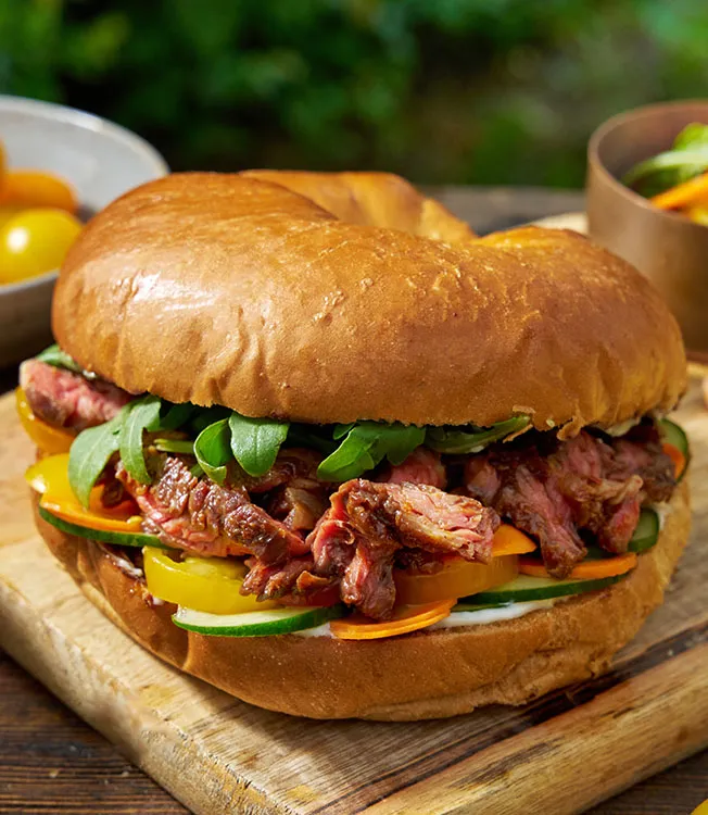 Juicy marinated beef in Kikkoman Kimchi Chili Sauce, served in a brioche-style bun with crunchy pickles, tomatoes and rocket.