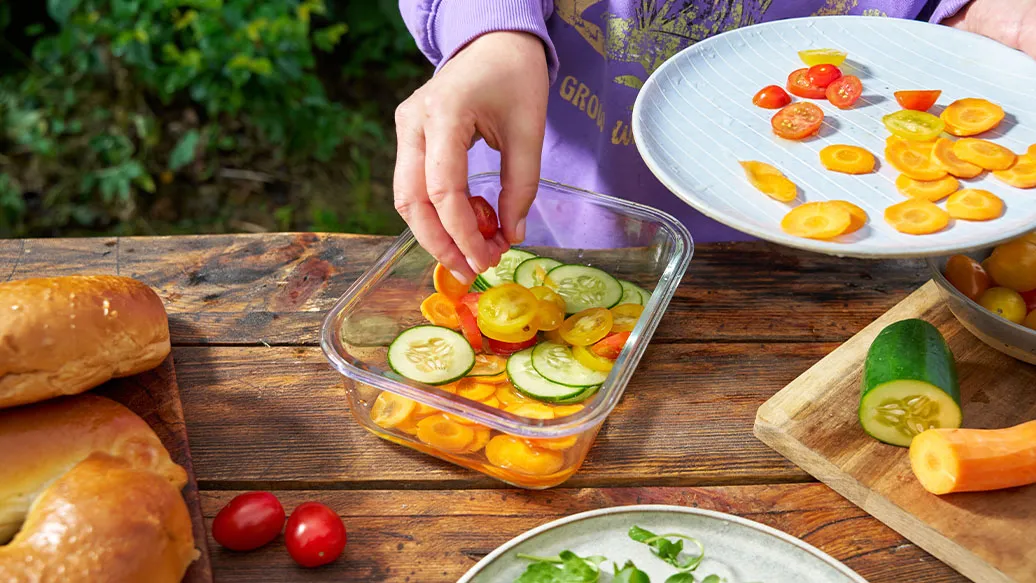 80 g fresh cucumber – 80 g carrot – 20 ml rice vinegar – 1 tbsp honey – 80 g cherry tomatoes