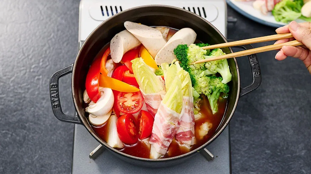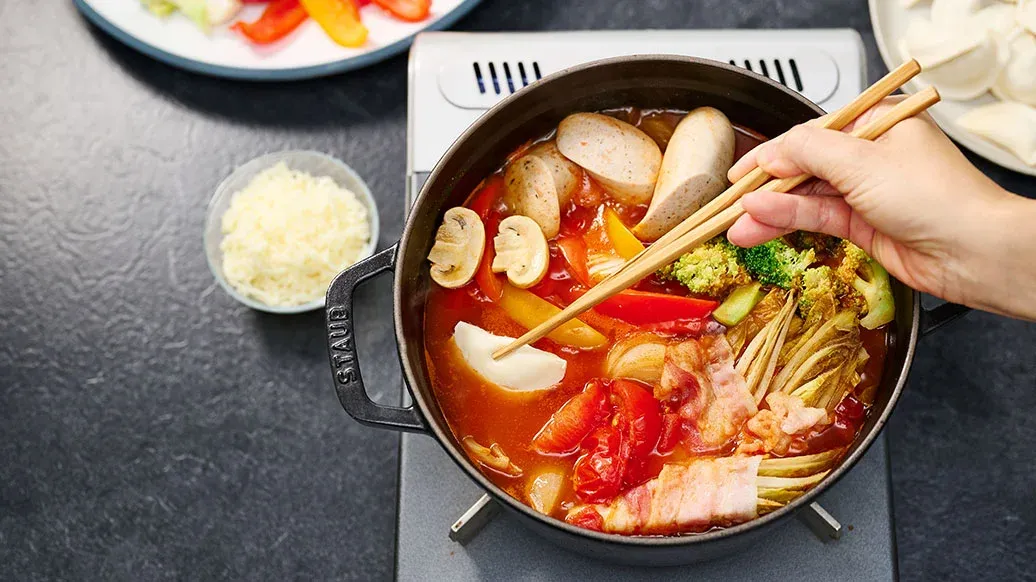 A simple hot pot featuring familiar European ingredients, with the tang of tomato and the heat of Kikkoman Kimchi Chili Sauce. Smoky bacon, sausages and melted cheese add rich umami. Quick to cook at the table and ideal for sharing.