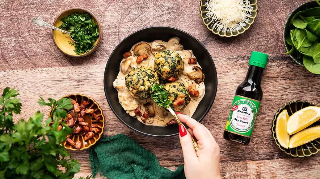 Light spinach bread dumplings made from leftover rolls, enhanced with Kikkoman Less Salt Soy Sauce and served with a creamy mushroom sauce and a little crispy bacon—a simple, comforting dish that makes good use of day-old bread.