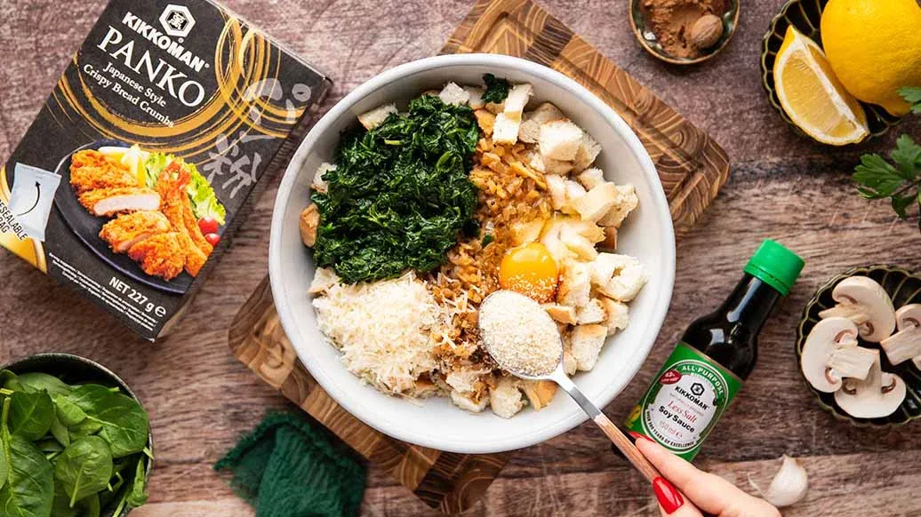 10 g butter – 180 g finely chopped baby spinach – 40 g finely diced onion – 60 ml milk – 1 ½ tbsp Kikkoman Naturally Brewed Less Salt Soy Sauce – ⅓ tsp freshly ground black pepper – ¼ tsp nutmeg – 150 g stale bread rolls, diced – 15 g Grana Padano – 1 ½ tbsp Kikkoman Panko - Japanese style crispy bread crumbs – 1 egg
