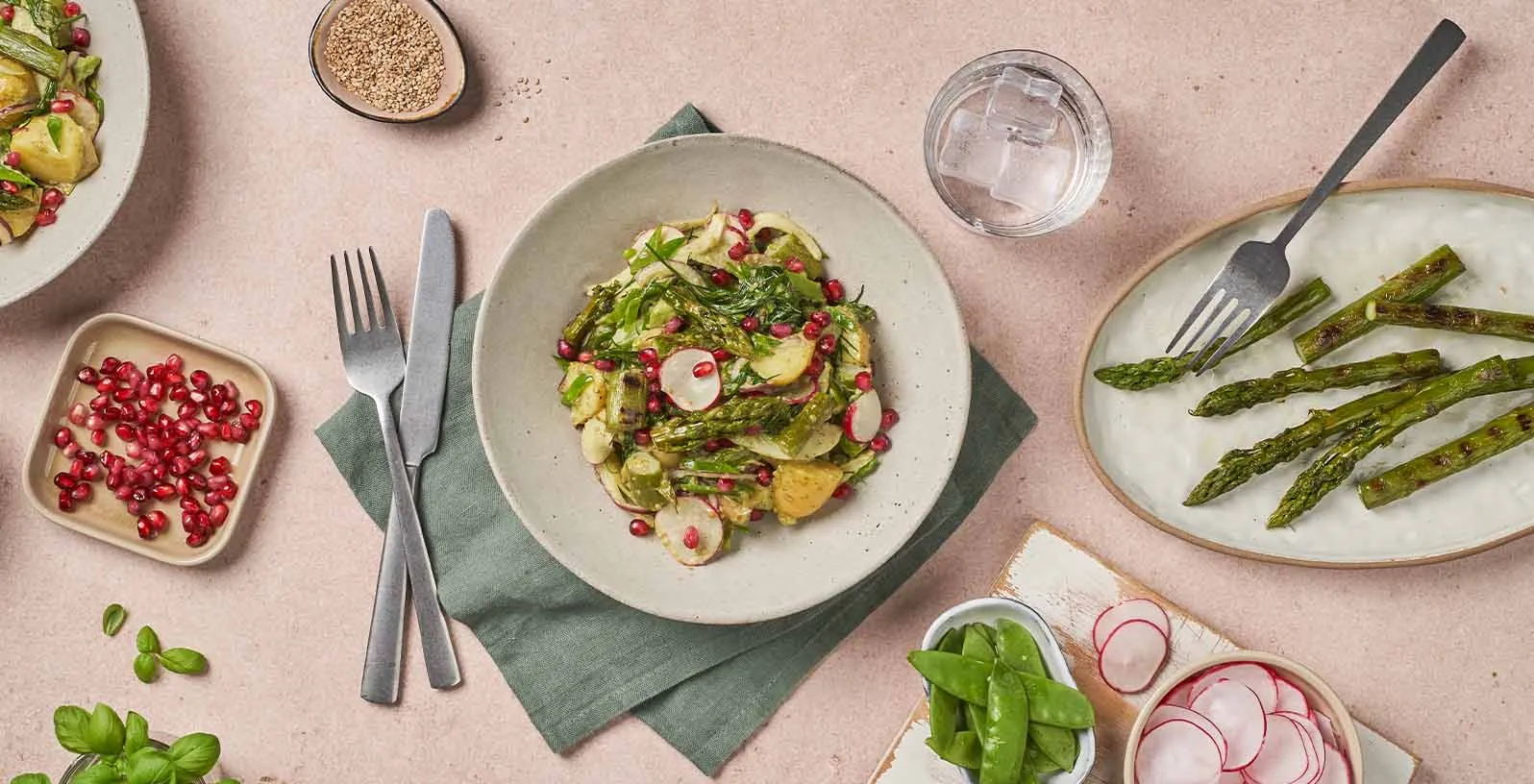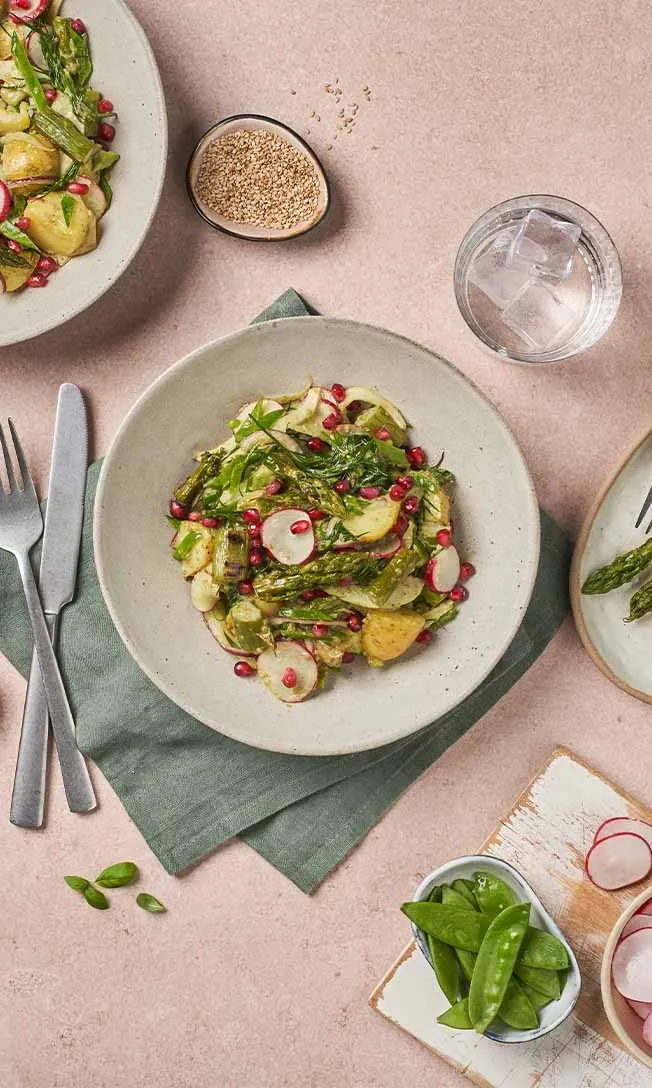This salad is a vibrant East-meets-West fusion that celebrates the best of spring. A mix of grilled asparagus and other colorful veggies, drenched in a creamy, hand-ground Basil-Goma dressing. Finished with velvety avocado and popping pomegranate seeds.
