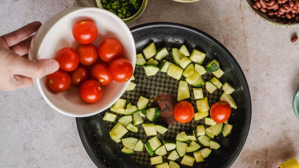 Preheat the oven to 200 °C. Cut the peppers in half lengthways and remove the seeds. Cut the courgette into approx. 1 cm pieces. Heat the olive oil in a pan and sauté the courgette for 2-3 minutes until soft. Add the cherry tomatoes and fry for a further minute.