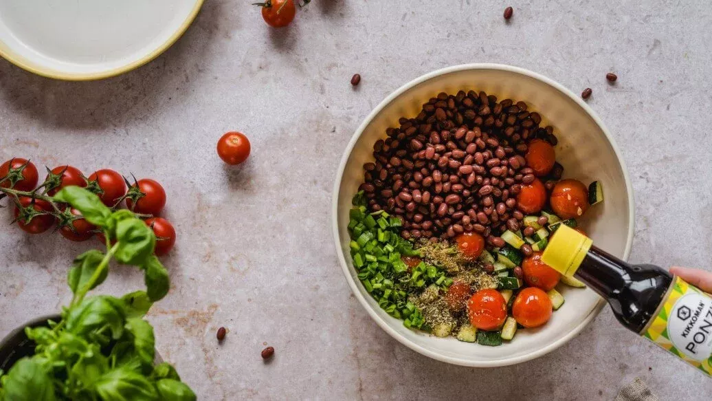 300 g cooked adzuki beans – 50 g cheddar cheese – 1 tbsp Kikkoman Ponzu Citrus Seasoned Soy Sauce - Lemon – 2 tbsp chopped chives – 1 pinch of pepper – 1 tsp dried oregano – 1 tsp ground coriander