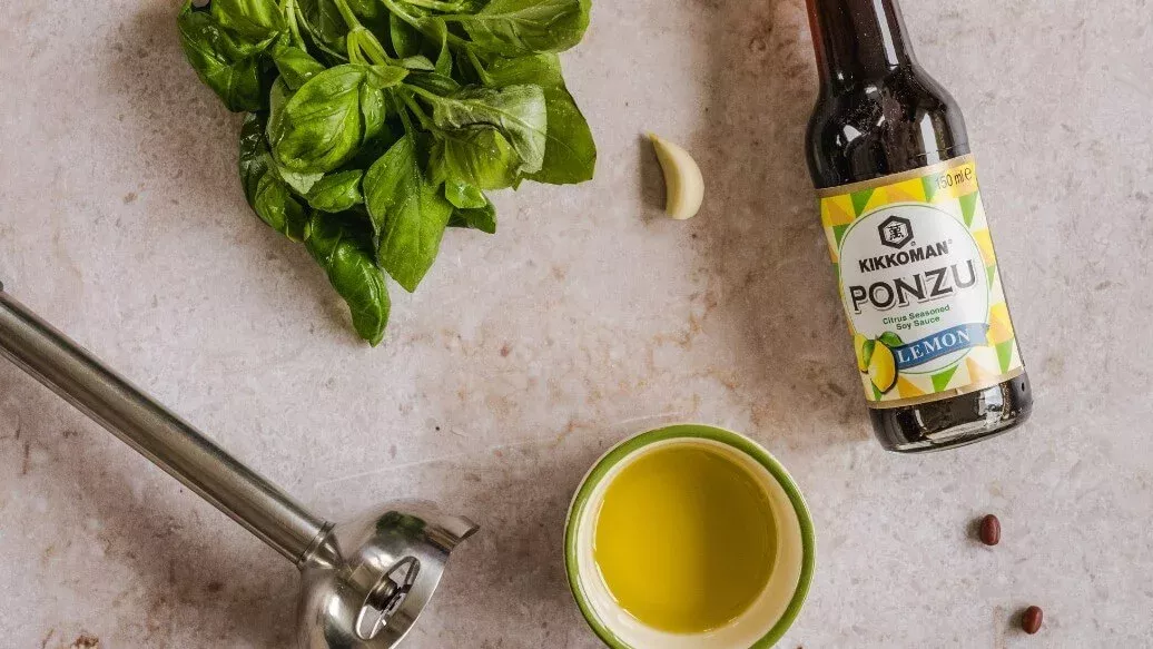 1 bunch of fresh basil – 3 tbsp olive oil – 1 tbsp Kikkoman Ponzu Citrus Seasoned Soy Sauce - Lemon – 1 clove of garlic, crushed