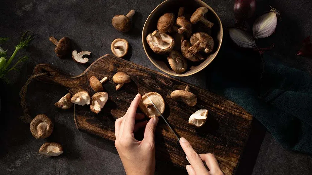 3 tbsp rapeseed oil – 1 red onion, sliced – 100 g fennel, sliced – 150 g shiitake mushrooms