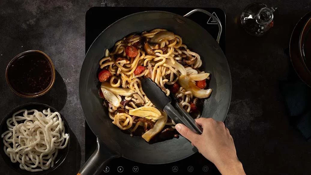 300 g udon noodles (vacuum-packed, cooked) – 100 ml Kikkoman Teriyaki Wok Sauce with Toasted Sesame – 1 tbsp Kikkoman Toasted Sesame Oil