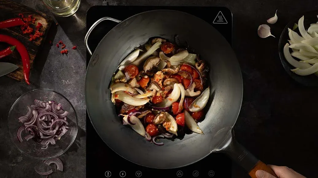 Add the garlic, chilli, ginger and tomatoes to the wok and fry for another 2 minutes. Deglaze with the water or stock, cover and simmer for 5 minutes.