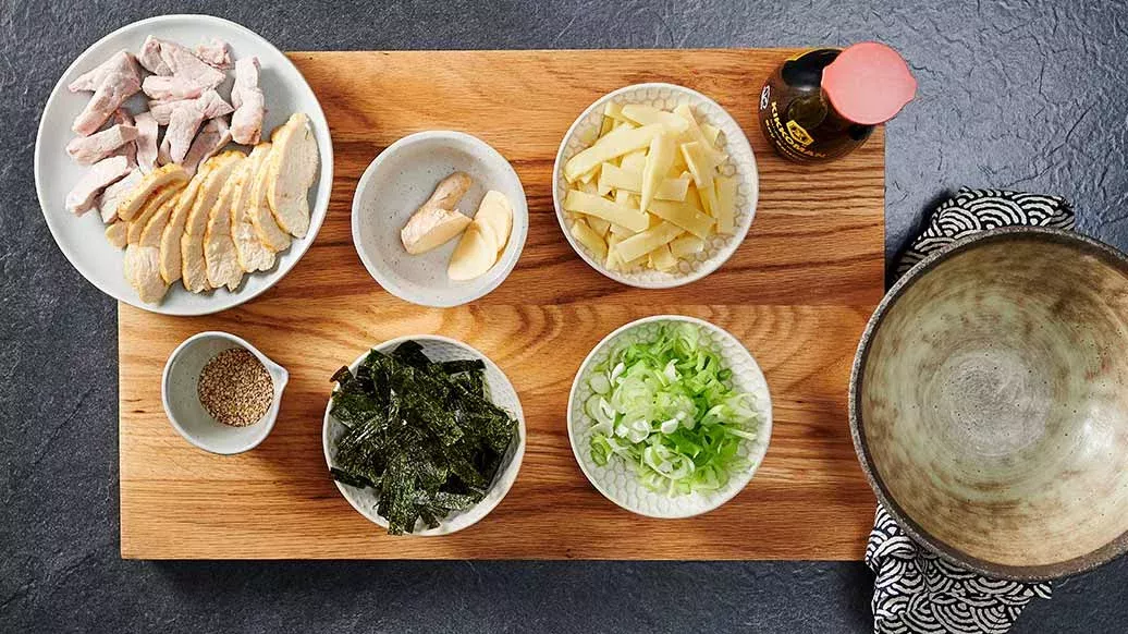 Drain the bamboo shoots. Cut the spring onions and nori into thin strips. Peel the ginger and cut into 4 thin slices (one per serving). Toast the sesame seeds until golden brown in a frying pan. Cut the pork and chicken into slices.
