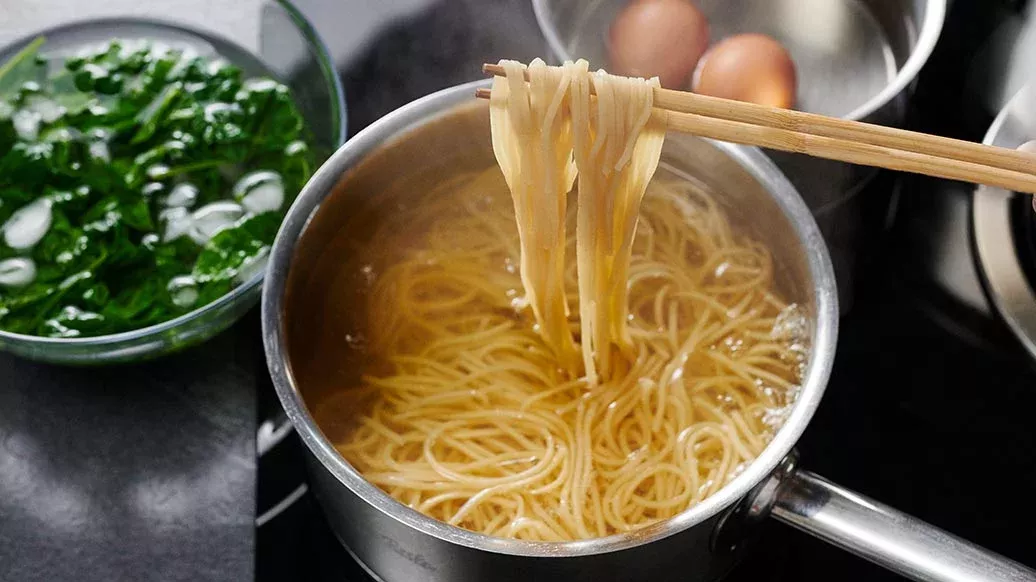 Cook the noodles until al dente and rinse under cold water. Blanch the spinach for 1 second and then plunge into iced water. Prick the egg shells. Place the eggs in boiling water and cook until soft boiled for 6 minutes. Pour the boiling water out of the pan and rinse the eggs under cold water.
