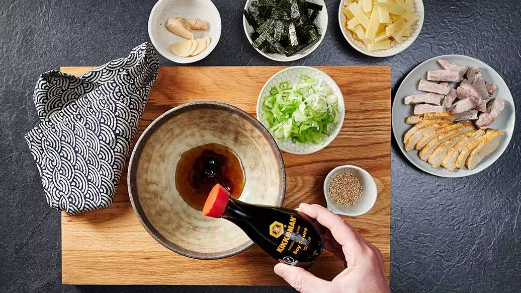 Put 1 tbsp. of Kikkoman Naturally Brewed Soy Sauce and 1 tbsp. fish sauce into pre-warmed soup dishes. Distribute the prepared soup ingredients into the bowls and top with boiling hot broth. Then peel and halve the eggs, and place half an egg in each bowl. Season with pepper to taste.