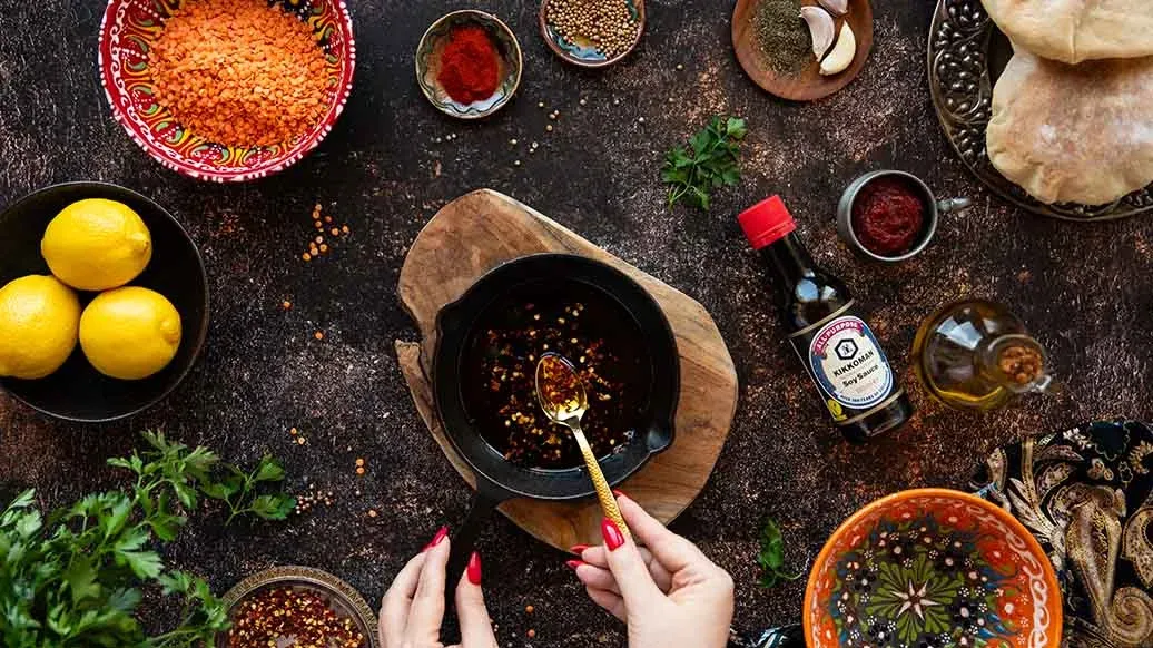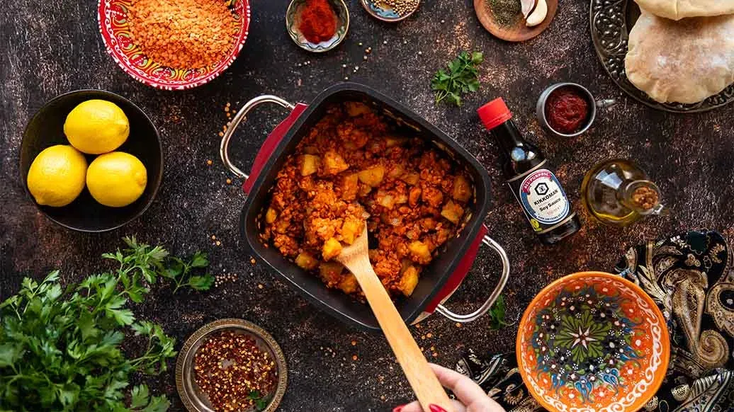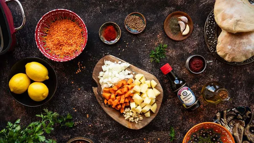 A comforting soup of red lentils, carrots, potatoes and garlic, simmered with spices and tomato purée. Kikkoman Soy Sauce adds rich umami depth, while mint, parsley, chilli and lemon give it a fresh, vibrant finish.