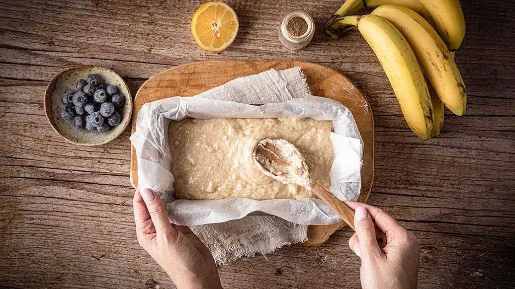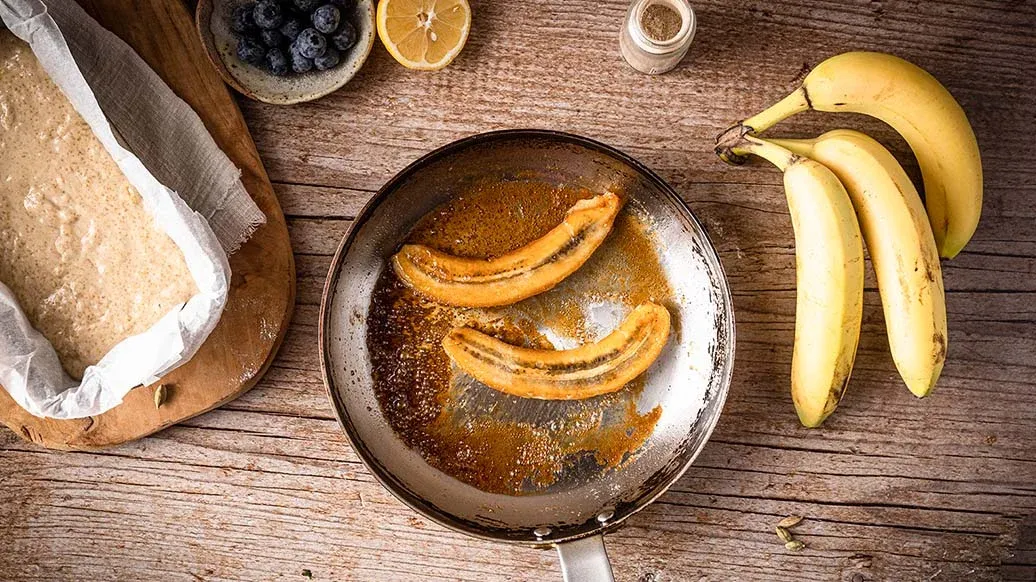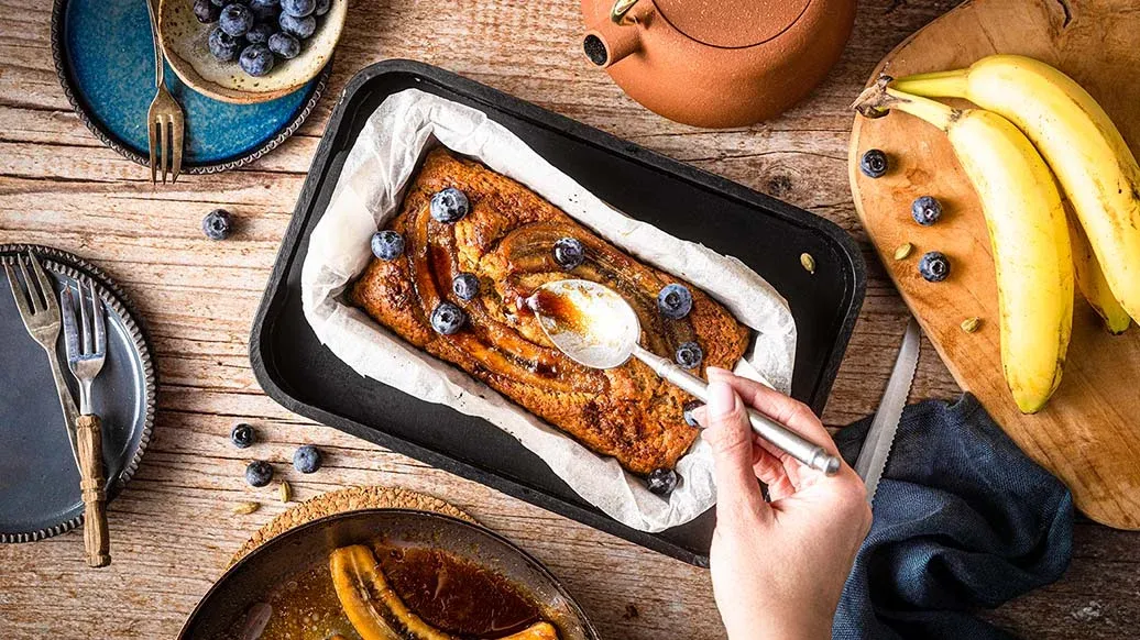 Arrange the caramelised banana slices on top of the batter and drizzle with the remaining glaze from the pan. Garnish with the blueberries. Bake at 180 °C for about 45 minutes. Let the banana bread cool before slicing and serving.