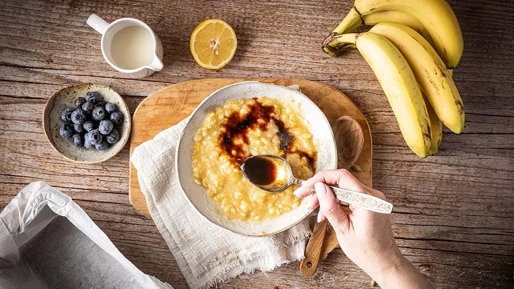 2 ripe bananas (about 200 g) – 1 tbsp lemon juice – 1 tbsp Kikkoman Naturally Brewed Less Salt Soy Sauce – 80 ml vegetable oil – 100 ml plant-based milk (e.g. oat milk)