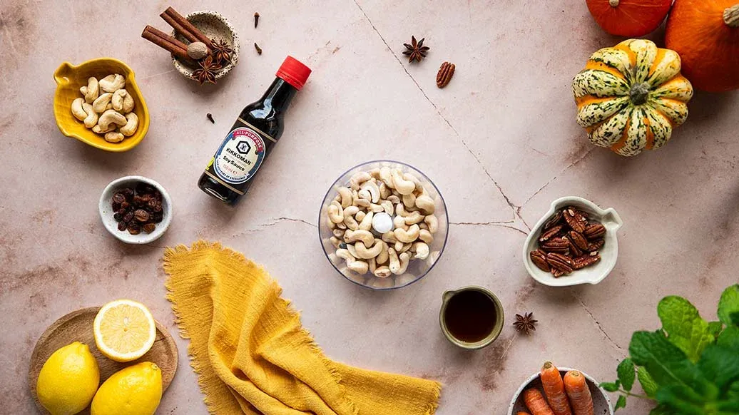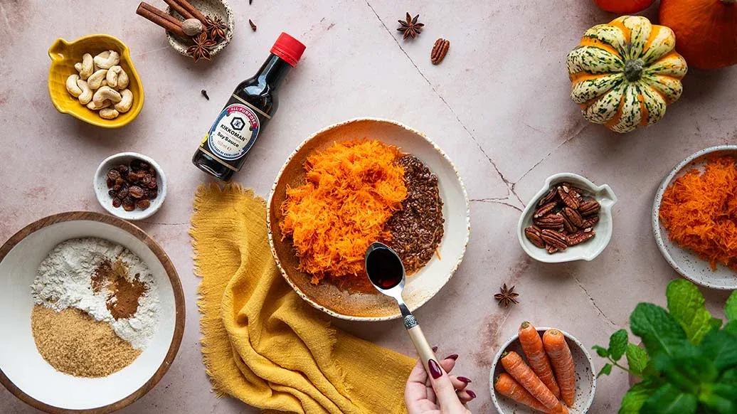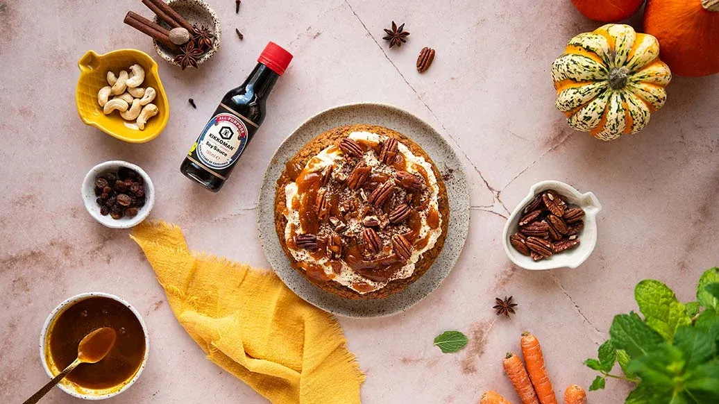 A vegan carrot cake with creamy cashew frosting, crunchy pecans and a pumpkin spice syrup with Kikkoman Soy Sauce—cosy, balanced and full of gentle umami depth.
