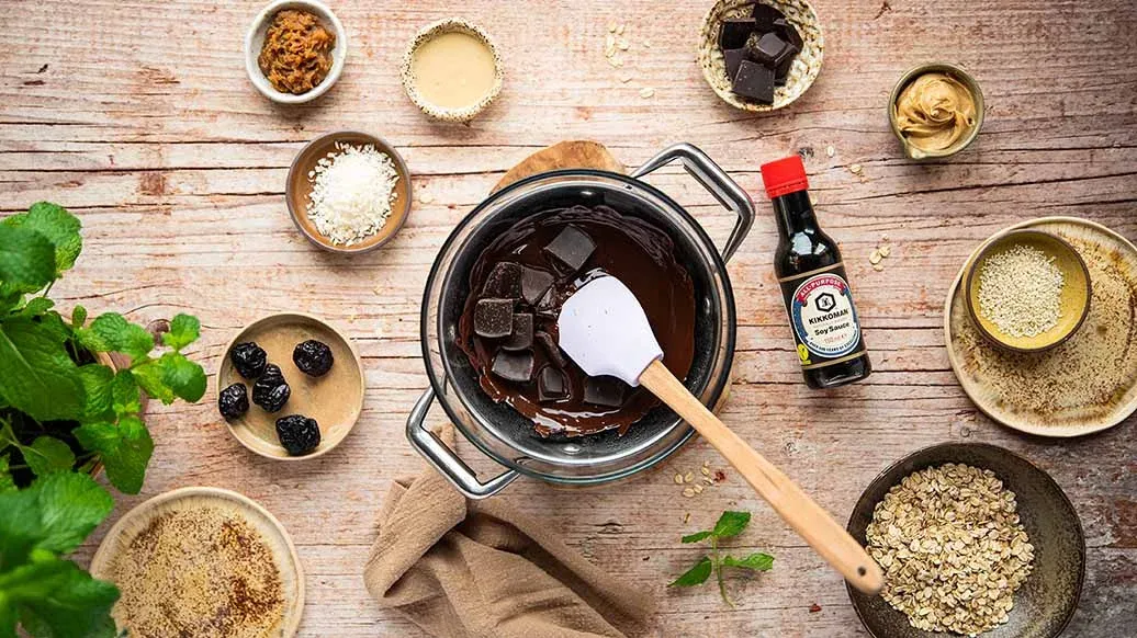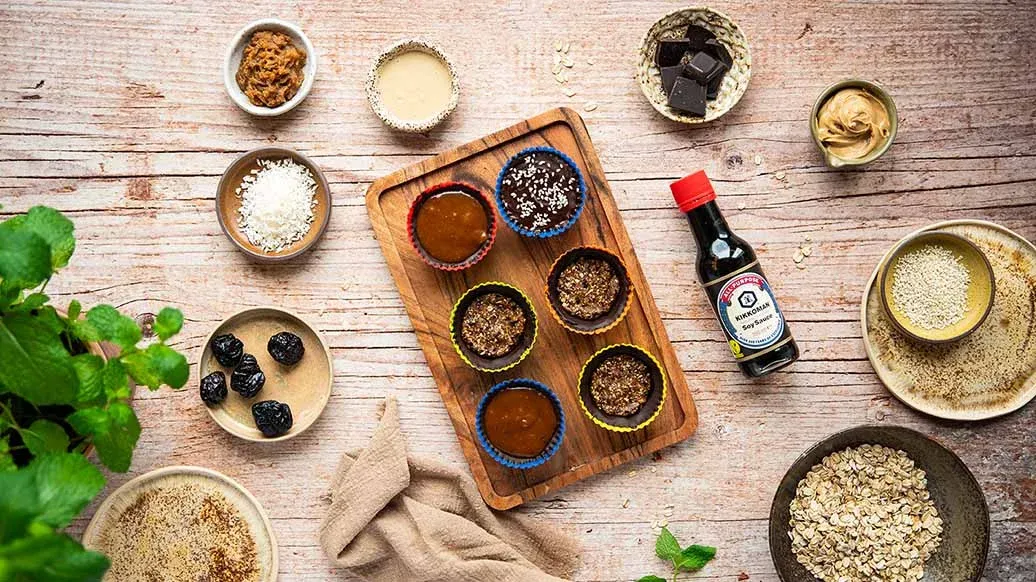 No-bake chocolate cups filled with plum nougat and chewy miso–soy caramel make the perfect vegan dessert. Kikkoman Soy Sauce enhances the sweetness of both the caramel and the chocolate, adding depth and a distinctive umami flavour.