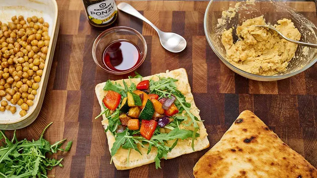 To make the dressing, mix 2 tbsp Kikkoman Yuzu Ponzu with the honey. Wash and pat dry the rocket. Cut the flabattas open and coat both sides with the hummus. Top the bottom halves with the rocket and grilled vegetables, drizzle with the dressing and place the top halves on top. Garnish with a few crispy chickpeas as desired and serve the rest on the side with any leftover veg.