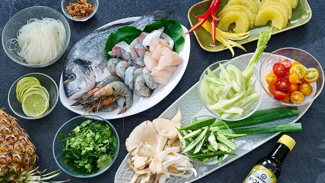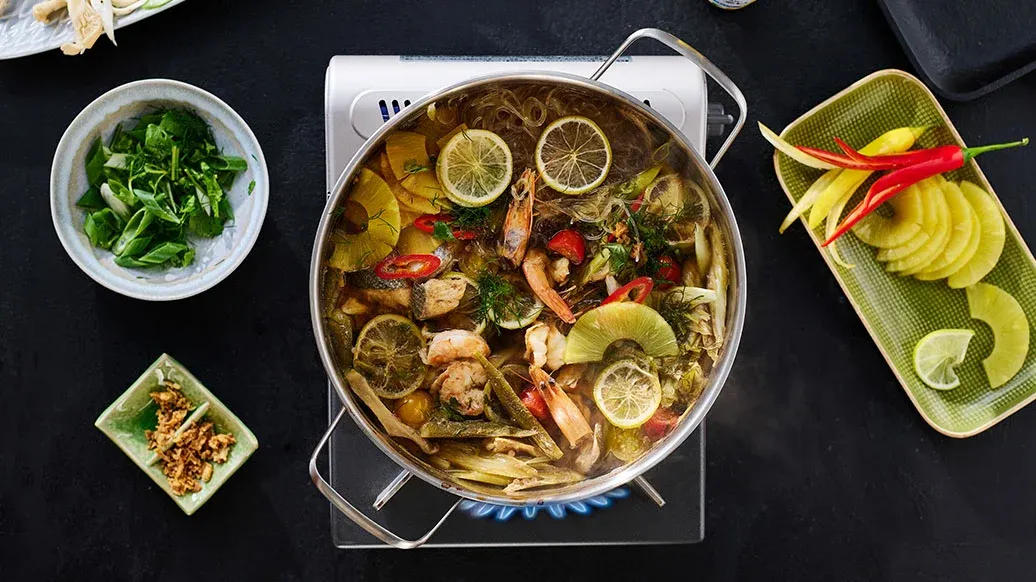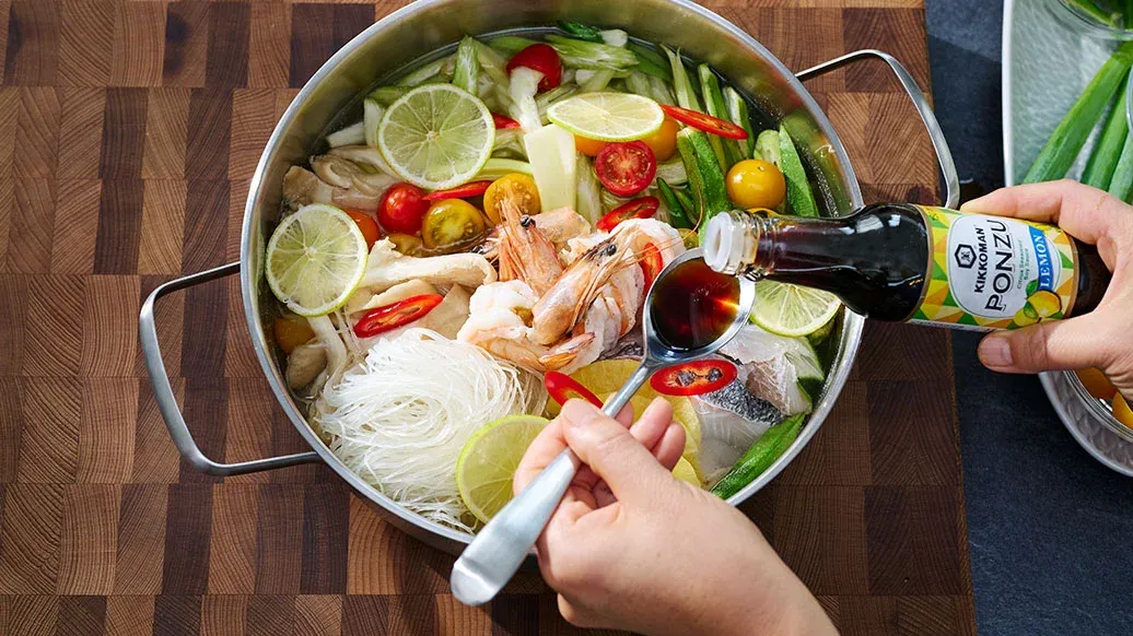 A canh chua–inspired sweet-and-sour fish broth with herbs, seafood, vegetables, pineapple and tomatoes. Enhanced with Kikkoman Ponzu Lemon, it’s light, aromatic and perfect for sharing at the table.