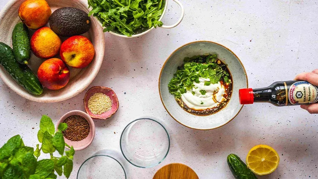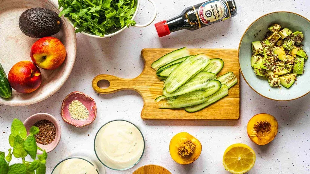 1 Hass avocado – 1 tbsp olive oil – 1 tbsp Kikkoman Naturally Brewed Soy Sauce – 1 tbsp sesame seeds – 1 tbsp linseed – 2 nectarines – 2 cucumbers