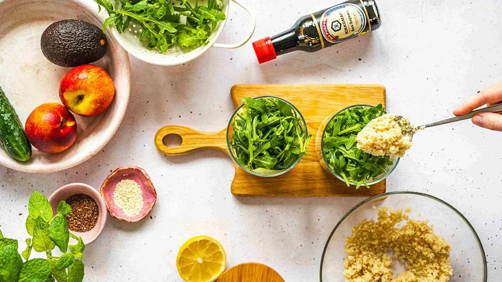 Cut the avocado into cubes and mix with the sesame seeds, linseed, Kikkoman Soy Sauce and olive oil. Arrange them in jars. Add the diced nectarines and sliced cucumbers.